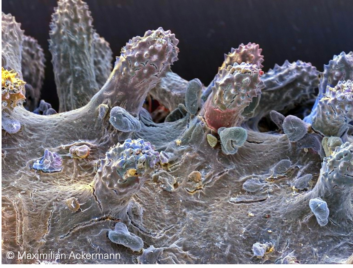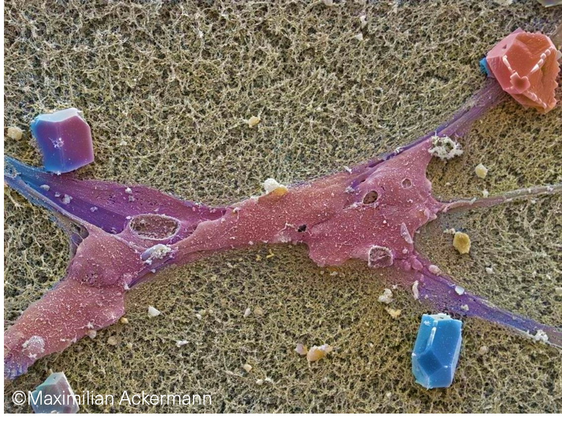 Coloured scanning electron micrograph of the tube formation of endothelial cells interfered by particulate matter from road dust.