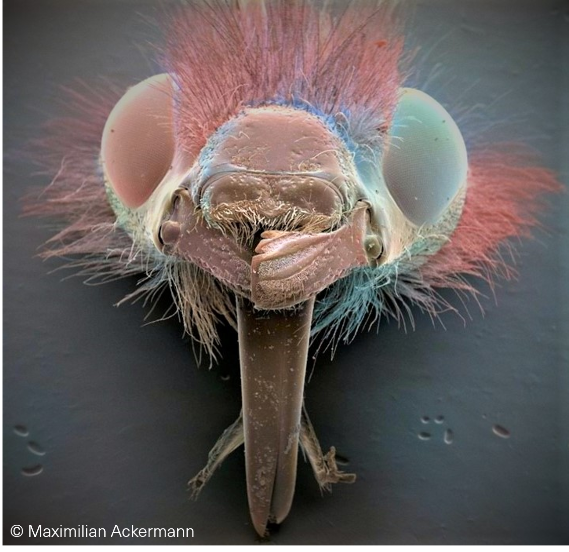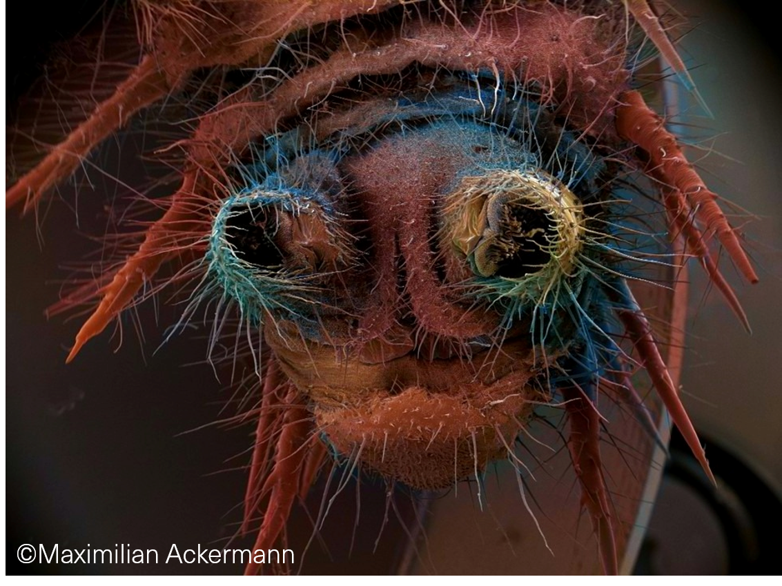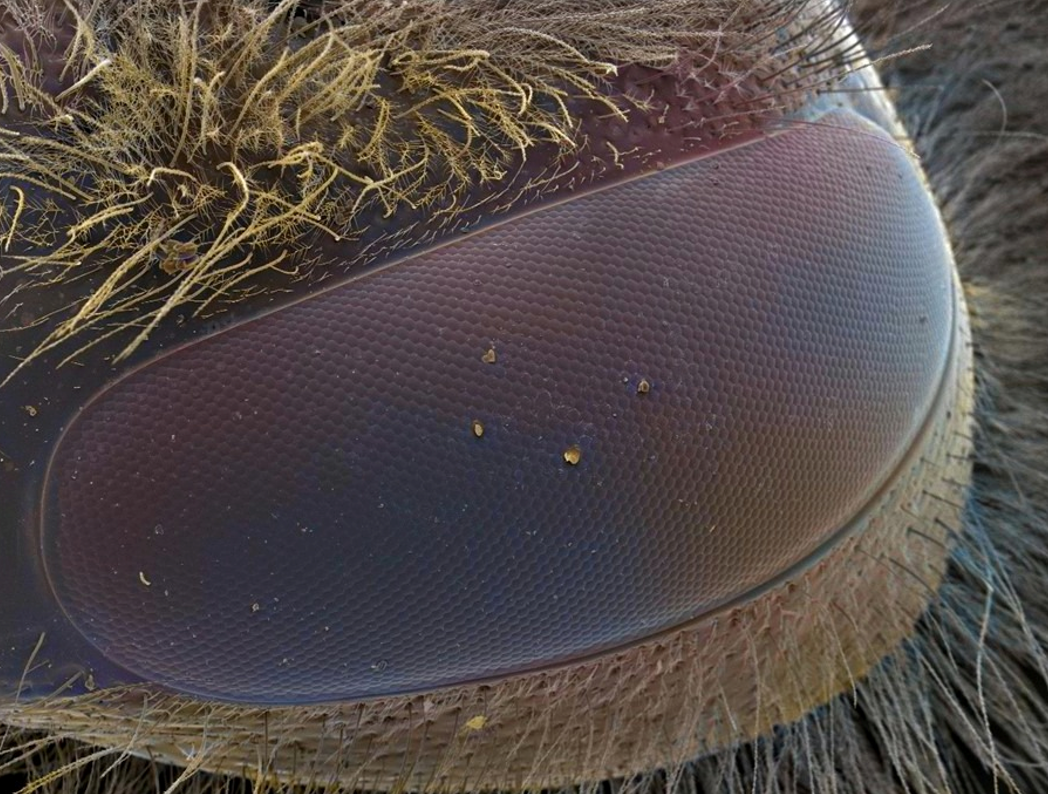 Coloured scanning electron micrograph of a wasp eye (“compound eye”), oval shaped composition of thousands of small faceted, telescope-like omatidia.