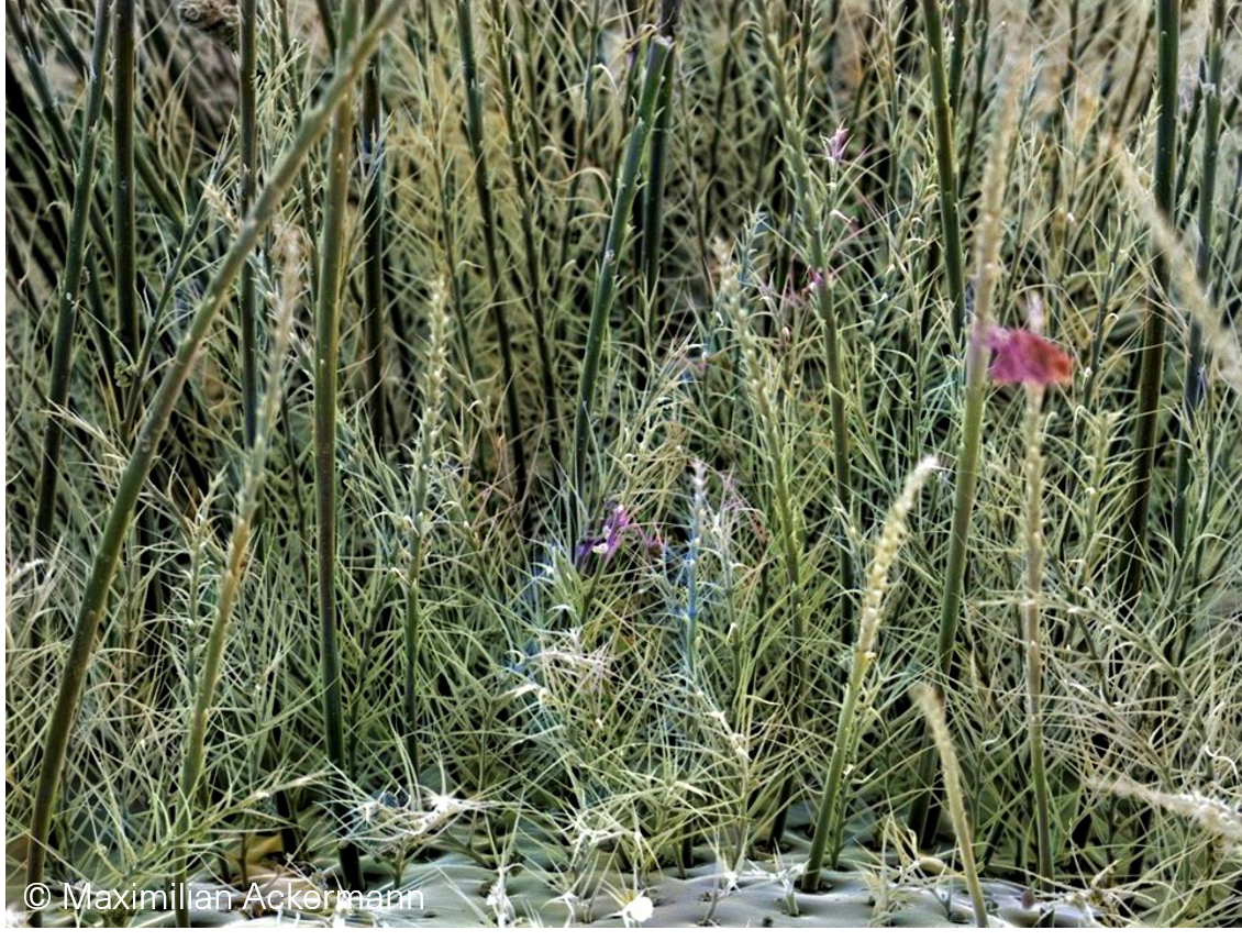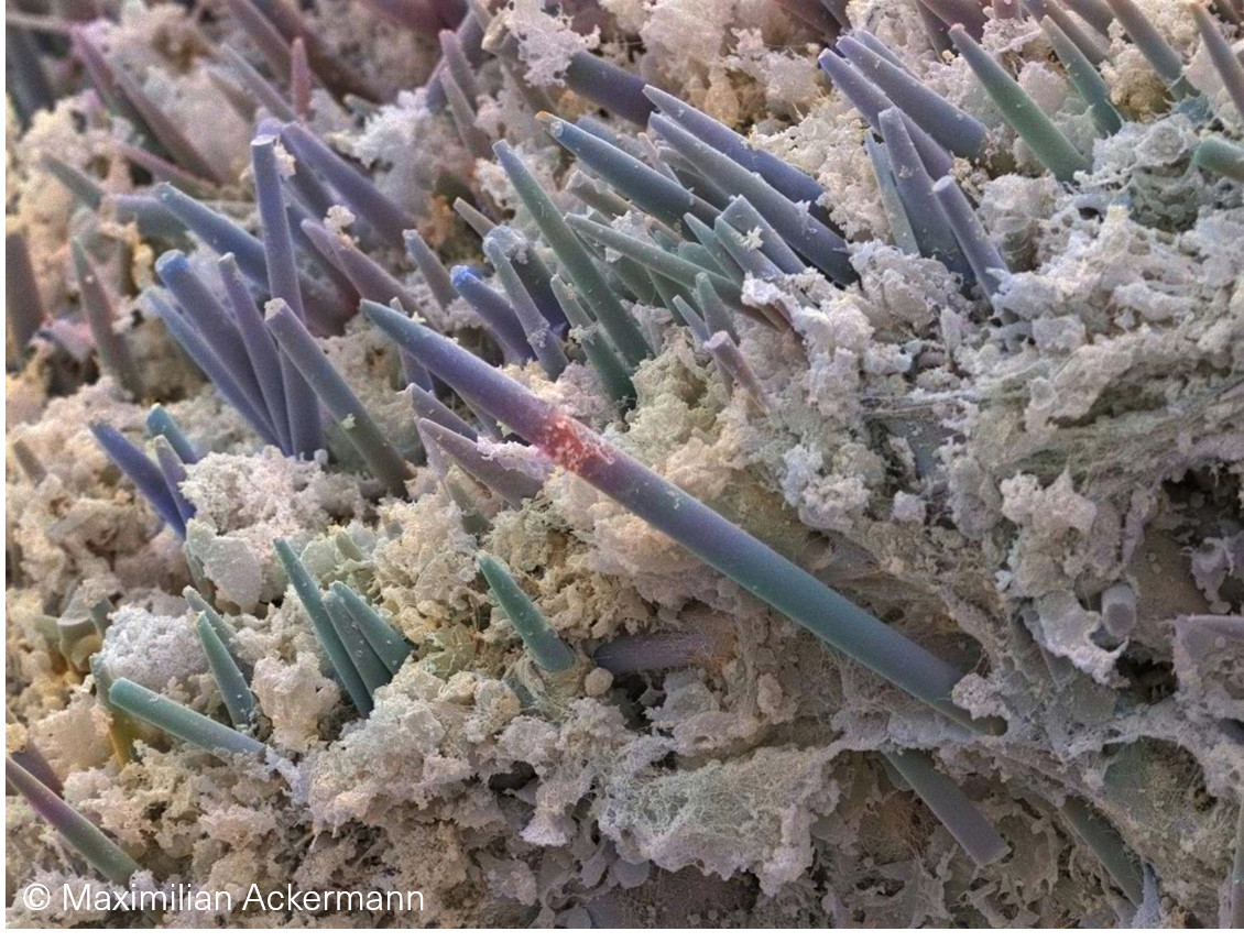 Coloured scanning electron micrograph of a deepwater sponge from Lake Baikal with bioglass spikes (spicula).